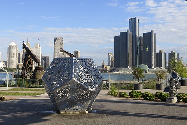 This prism, constructed out of eleven pentagon sheets, has laser cut patterns on each face. The interior light fixture shines through the pentagon faces creating and ever-changing light pattern in the centre of the Rotary Club of Windsor (1918) Centennial Plaza. This sculpture is a legacy gift to the Windsor community through a partnership of the City of Windsor, Rotary Club of Windsor (1918), and ENWIN Utilities Ltd.