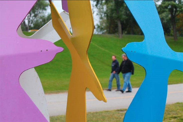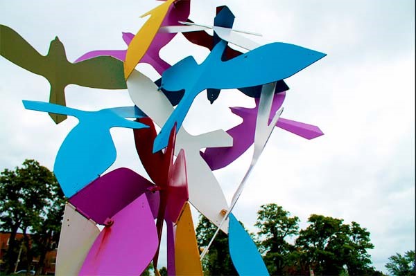 Gerald Gladstone's geometric sculpture presents a striking model of interdependence. In Morning Flight, we are presented with a complex balancing act.