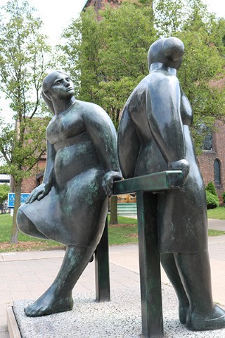 The two figures in Rosenthal’s Neighbours lean on opposite sides of a railing with their gaze just past one another. They lean together while waiting for something, possibly speaking softly to each other while passing the time. Their facial expressions parallel in their somber intensity. Their body language differs subtly. One figure leans forward expectantly, almost hopefully, as if they can see what is to come. The other leans with patient resolve.